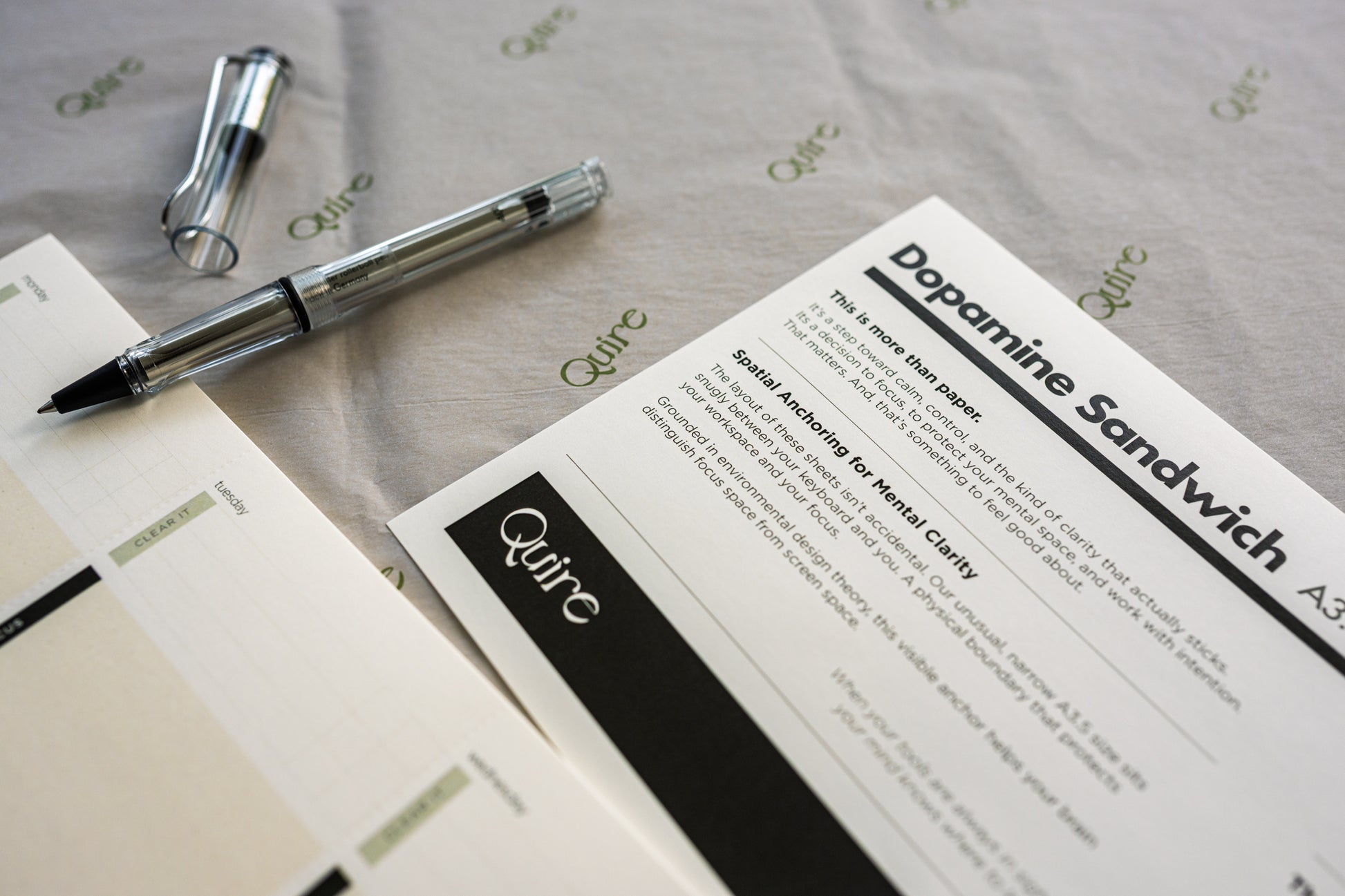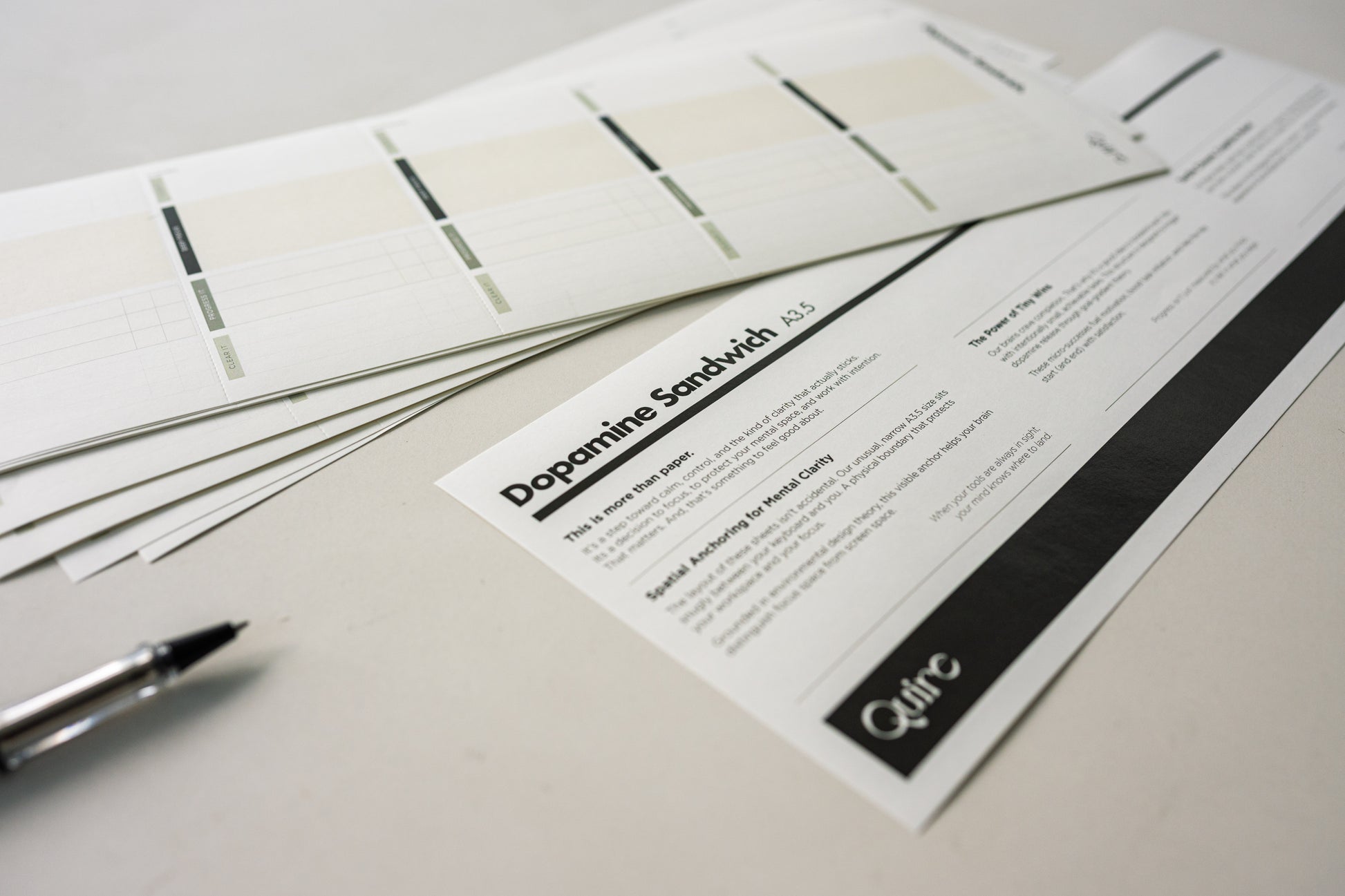 48 sheets for 48 weeks. Perforated weekly planners on premium 160gsm paper, packaged with the "why" of the Dopamine Sandwich.